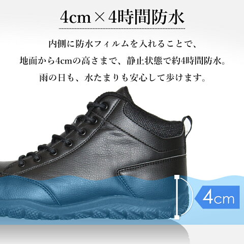 今期2022年秋冬モデルより、インソールもフリース仕様に!(旧色デニムのインソールはフリースではありません) ・つま先を守る鋼鉄先芯入り(JIS規格S級相当の強度) ※JIS規格やJSAA規格認定品ではありません ・内側に防水フィルムを入れている4cm×4時間防水(静止状態で地面から4cmの高さまで連続4時間防水)で、雨の日も安心。