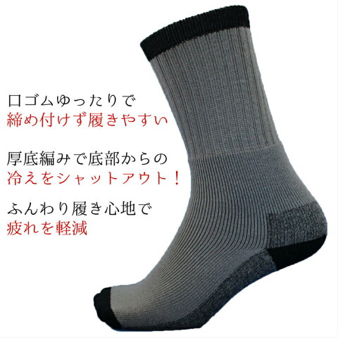 ゆったりした口ゴム で締め付けず、履きやすさバツグン! サイズ:24.5〜27cm 品質:アクリル、ポリエステル カラー:黒 、 グレー 、2色 先丸タイプ3足組 靴した くつ下 ぐん足 軍そく 保温 暖か あたたか あったか 冬 消臭 匂い 臭い 安全靴 仕事 作業 クロ ブラック 灰色