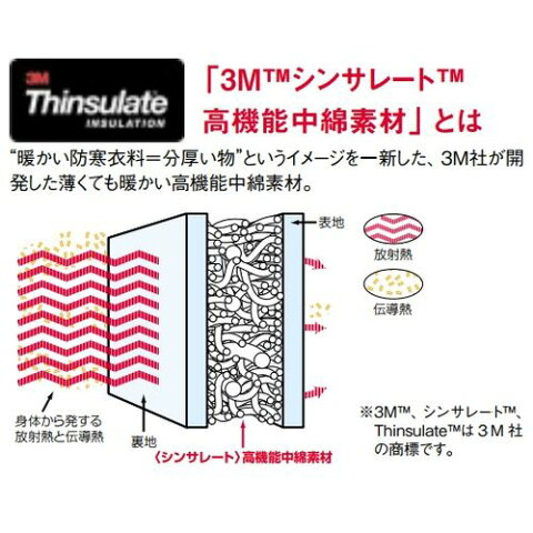 <特徴> ●内装材に起毛ポリエステル採用 ●夜間も安心「再帰反射材」付 ●「3Mシンサレート高機能中綿素材」を使用。