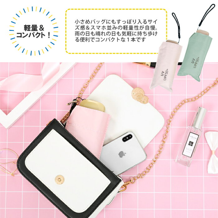 スマホサイズでも充分な機能 撥水加工で雨からガード 晴雨兼用:降雨時のご使用においても防水性に優れているので雨の日、晴れの日兼用ご利用頂けます。