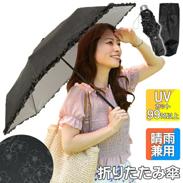 紫外線カット99% 日傘 晴雨兼用 折りたたみ傘 UVカット シルバーコート フリル付き 撥水加工 ついで買い特集 夏物特集【 日よけ 紫外線対策 遮光 暑さ対策 女性 レディース 軽量 花柄 おしゃれ 黒 】 ◇ ミスティブロッサム傘