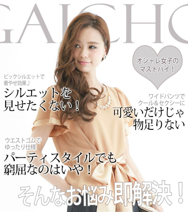 体型カバーポイント ------------------------------------------------------------ 【脚】【ヒップ】【脚】 たっぷりボリュームを持たせたガウチョパンツで気になるお尻〜脚をしっかりカバー。