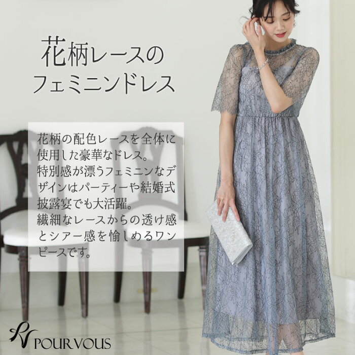 配色レースが華やかな総レースドレス ------------------------------------------------------------ 花柄の配色レースで豪華に仕上げたワンピースドレス。