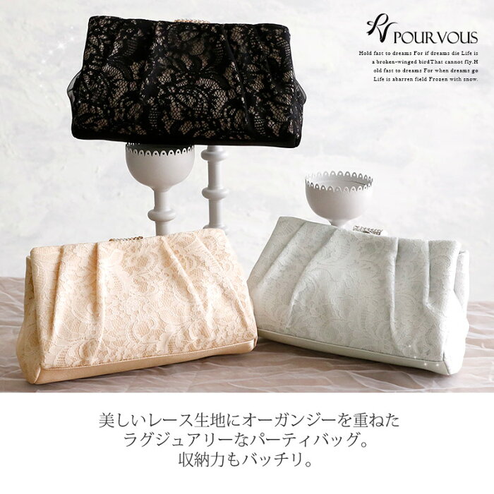 レースにオーガンジーを重ねたラグジュアリーデザイン ------------------------------------------------------------ レースの繊細さとオーガンジーの美しい透け感を楽しむことが出来るバッグ。
